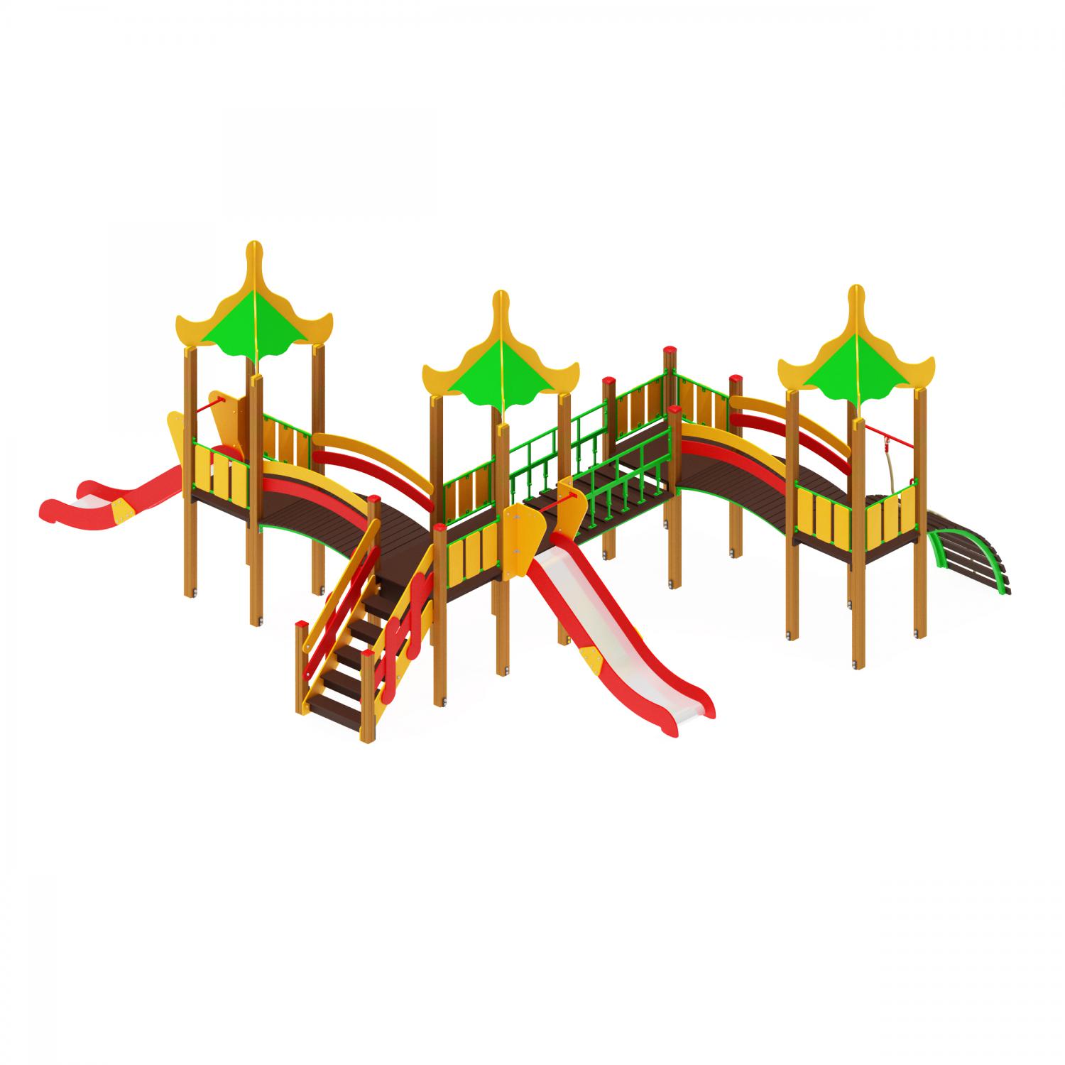 1. Башни: Изготовлены из четырёх склеенных между собой брусьев сечением 100×100 мм и высотой 2800 мм. Пол башен сделан из ламинированной фанеры с антискользящим слоем, размером 1000×1000 мм и толщиной 18 мм, установленный на высоте 1200 мм от уровня площадки. Над каждой из трёх башен располагается четырёхскатная крыша, собранная из фанеры и укреплённая на декоративные арки толщиной 18 мм. Четвёртая башня немного ниже – её высота 2000 мм, и она также оснащена полом из ламинированной фанеры с антискользящим покрытием и без крыши. Всего башен предоставляется четыре штуки.